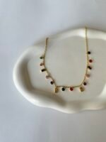Delicate and playful, this gold-tone necklace features dainty multicolour stone charms that add a subtle pop of colour. Designed to sit beautifully on the neckline, it’s perfect for everyday wear, layering, or adding a soft accent to any outfit.