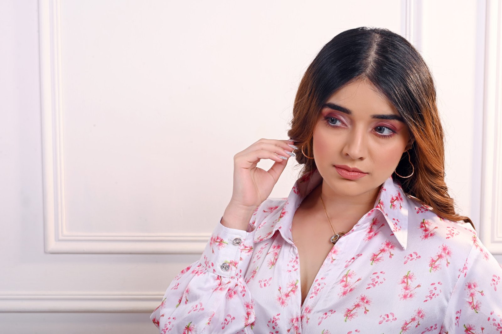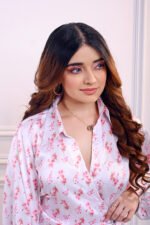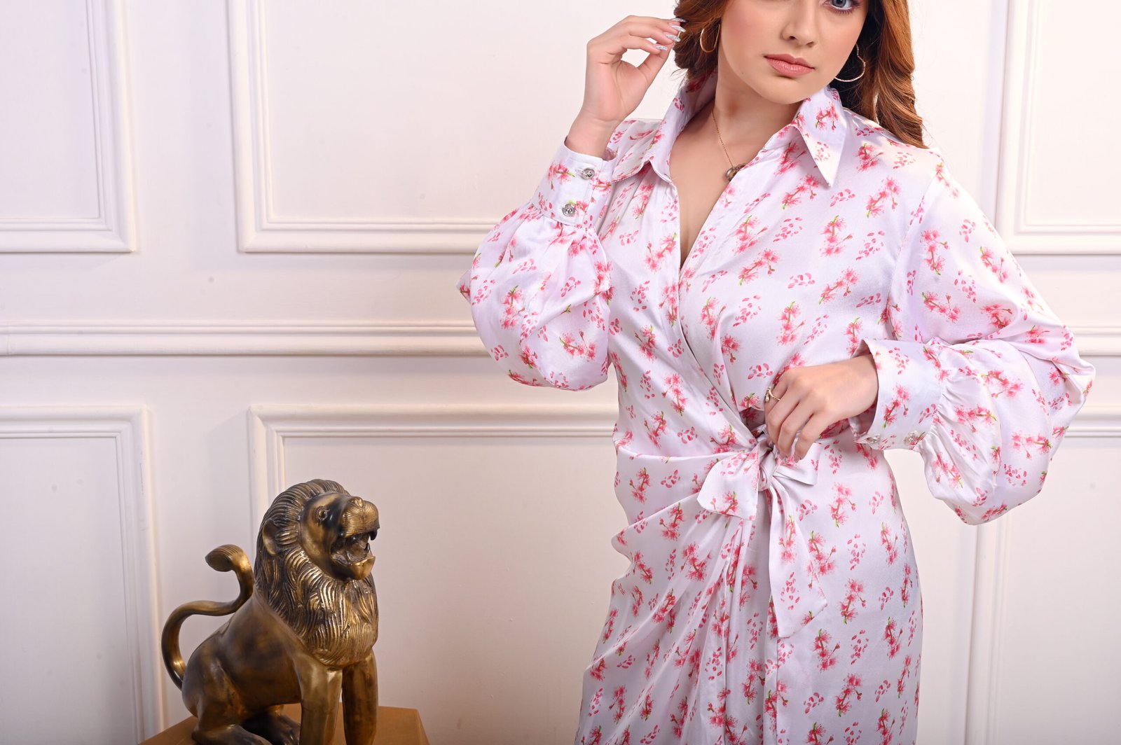 The Reva Dress is pure elegance in motion — a satin wrap dress adorned with delicate red floral motifs, designed to drape beautifully and flatter every curve.